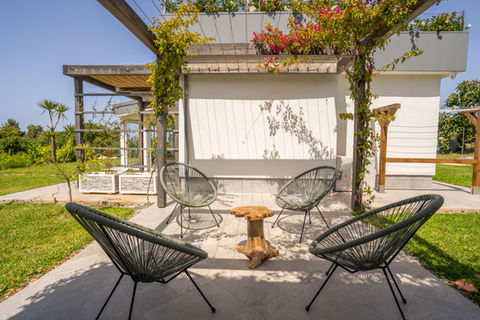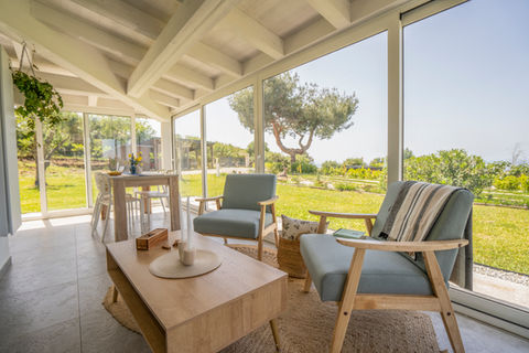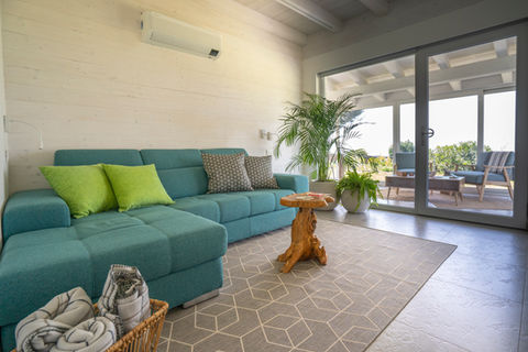 Due appartamenti indipendenti, ognuno con due camere da letto e un divano letto, per un totale di 6 posti letto, offrono la soluzione ideale per famiglie o gruppi di amici. Un soggiorno luminoso con TV e Netflix vi attende per godervi momenti di relax, mentre la cucina attrezzata con vista sul giardino vi invita a preparare deliziosi pasti in compagnia. Le ampie vetrate si aprono completamente, permettendovi di vivere il giardino anche all'interno. Per il massimo comfort, le camere sono dotate di aria condizionata, mentre i due bagni vantano docce spaziose con getti idromassaggio.